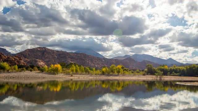 Snow capped Timpanogos Mountain glowing at sunset reflecting in Utah Lake from Provo boat harbor.