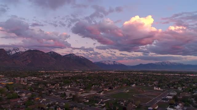 Colorful sunset from aerial view flying over town during winter with snow on the roofs in Utah.