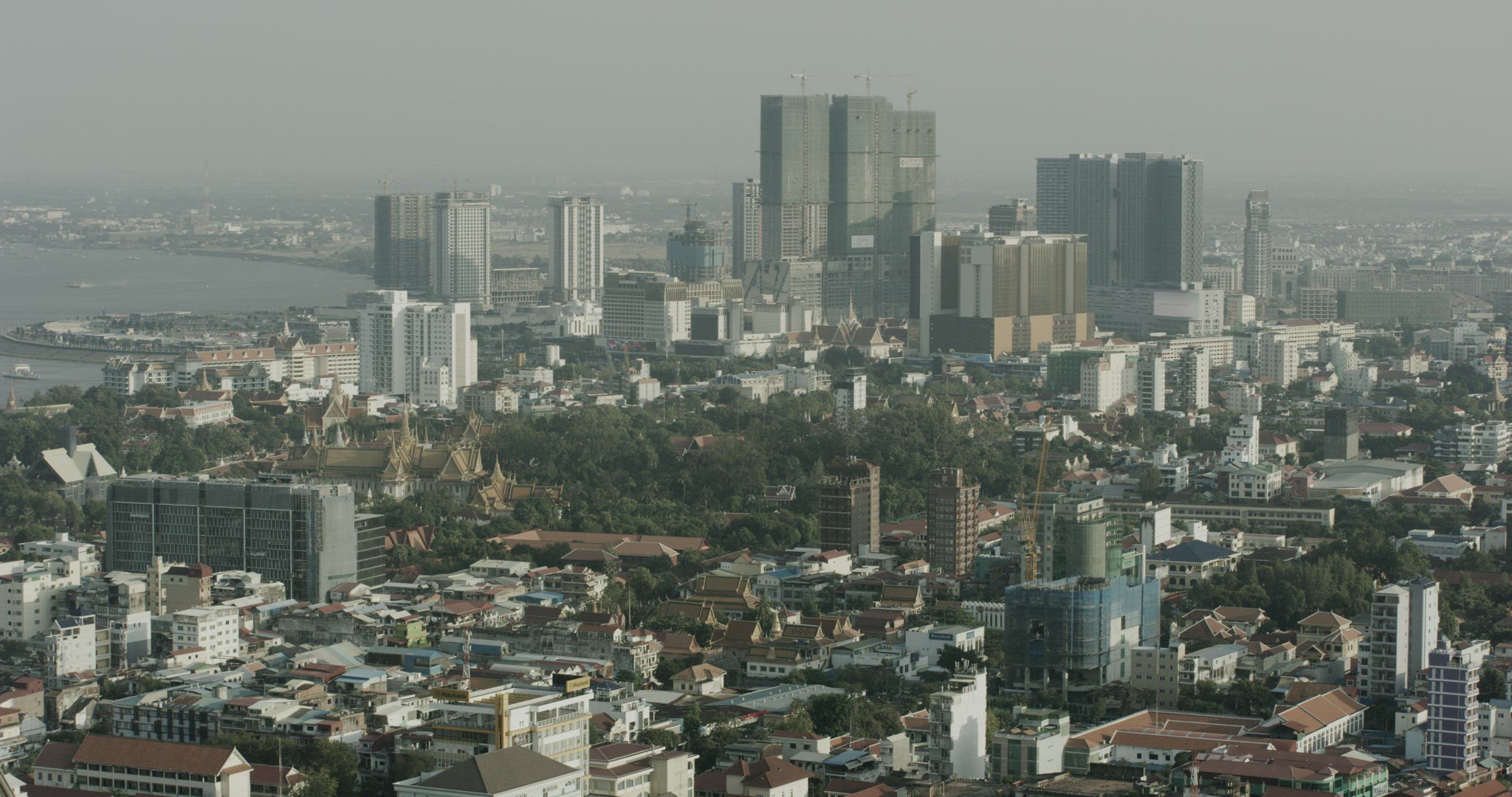 > Phnom Penh sky scrapers and river, long high pan