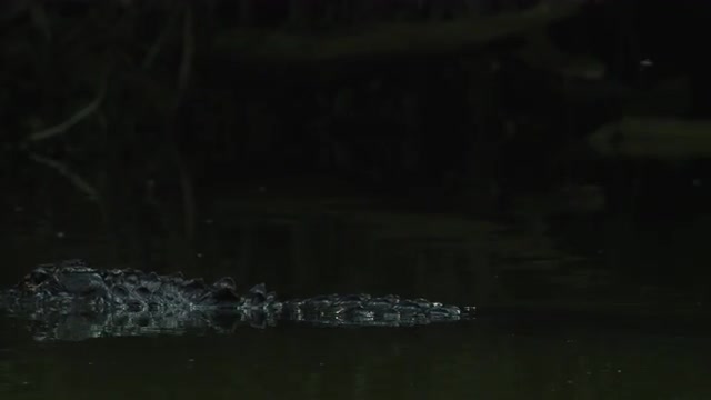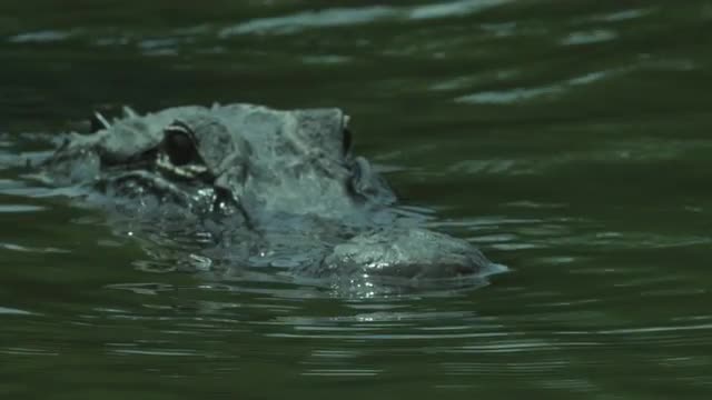 Slow motion, crocodile in water, half submerged.