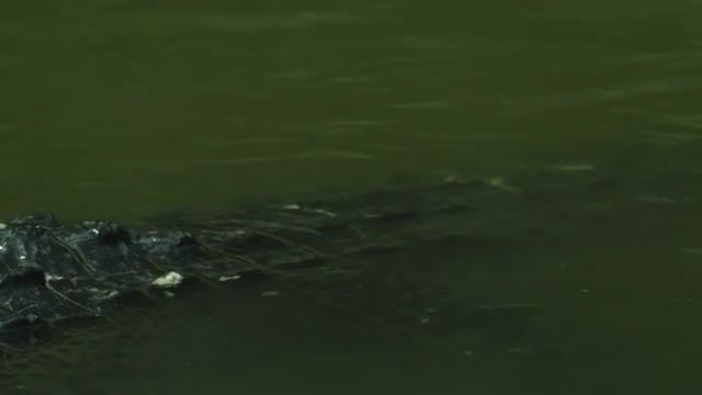 Slow motion, crocodile in water, half submerged.