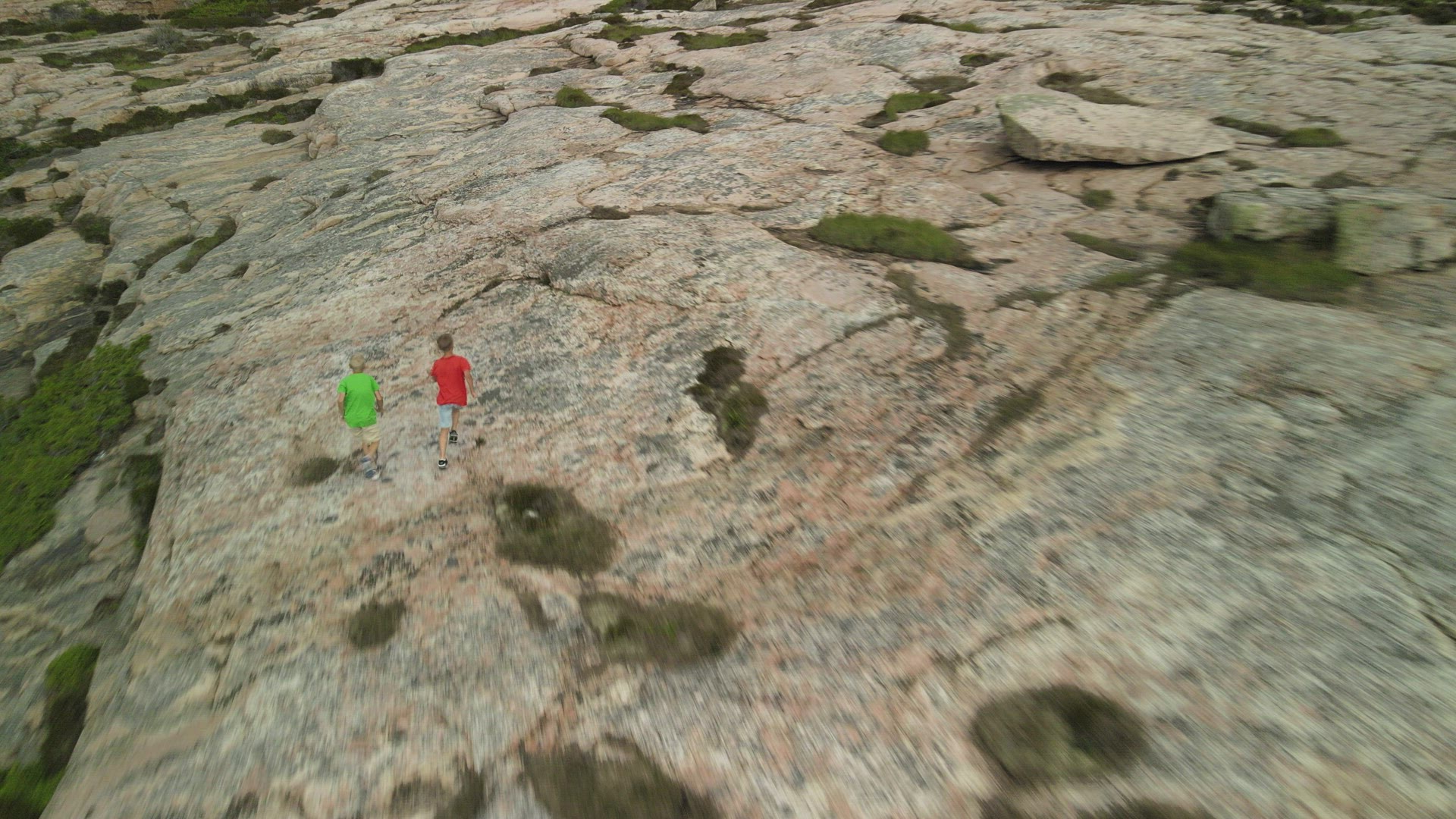drone shot - boys running over cliffs in Bohuslän