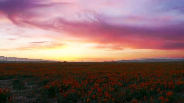 Time lapse footage of wild flower at full bloom with sunset in California Poppy Reserve in Antelope Valley