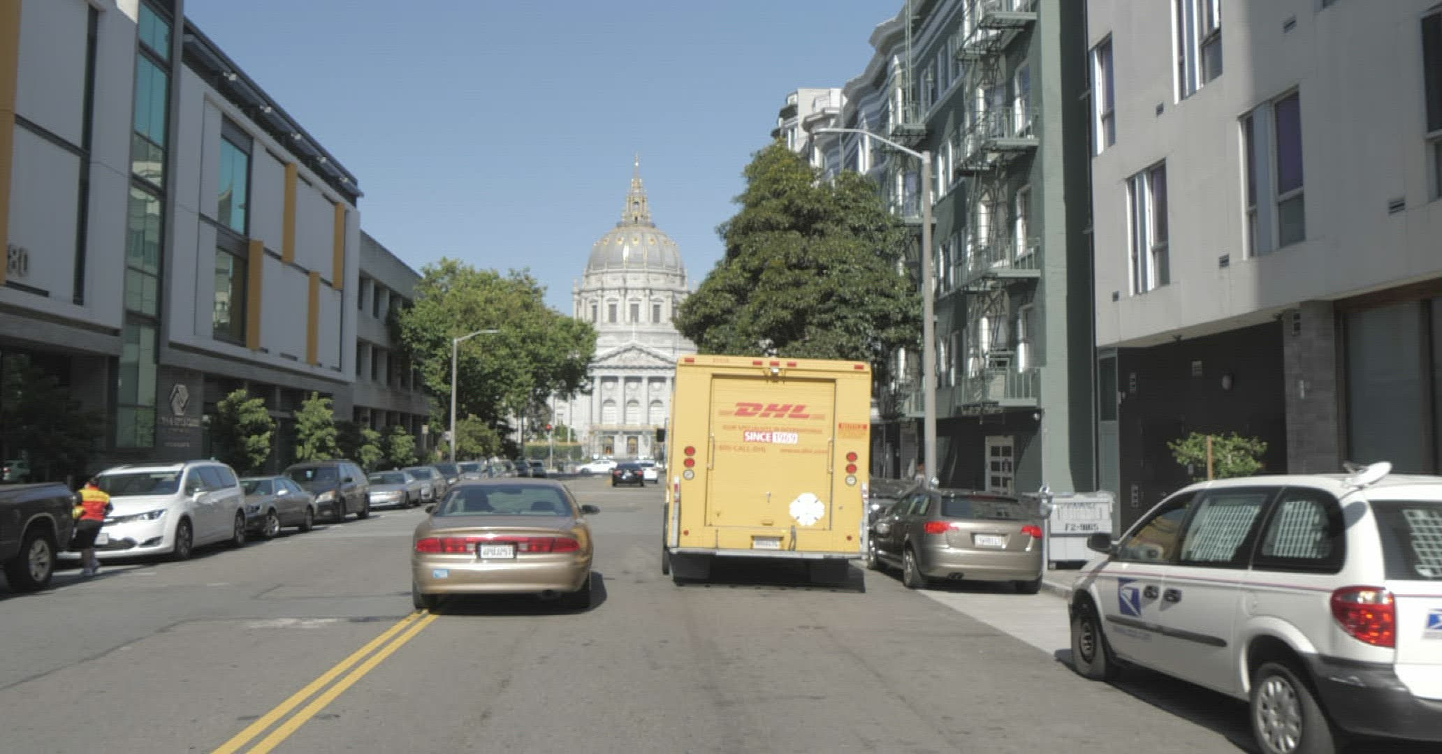 San Francisco Bay Area drone shot from the streets to city hall