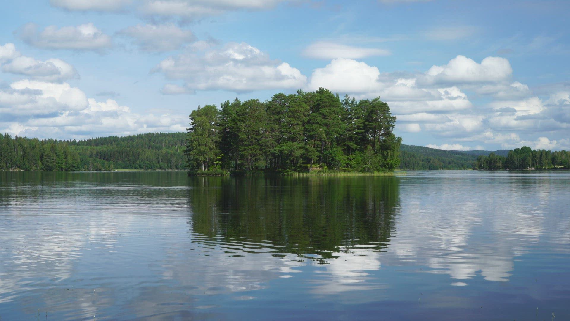 two boys in canoe - paddling on mirror lake with islet and forests in background