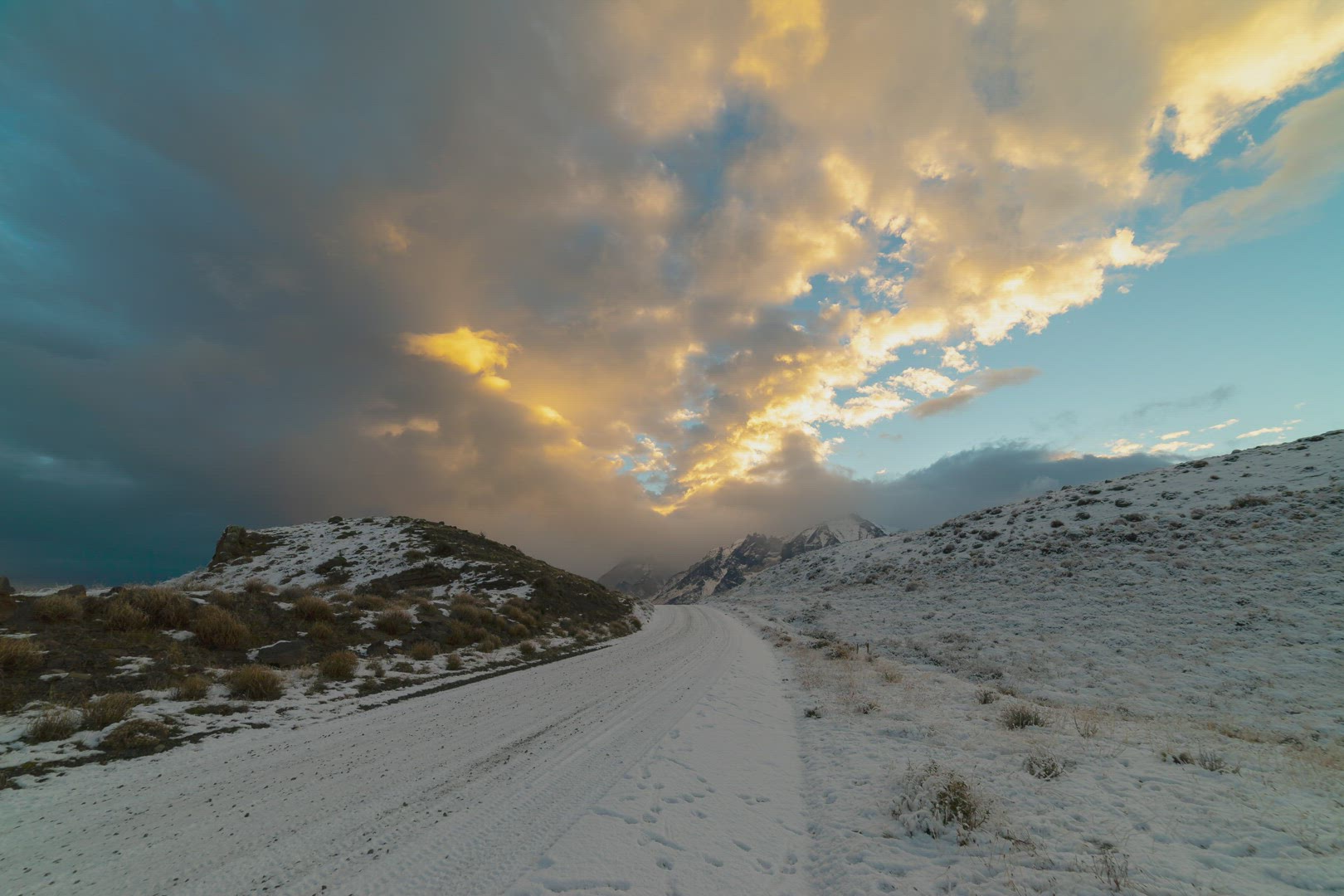 > Time Lapse Of Sun Lit Clouds Rolling Over Snow Covered Road At Torres del Paine
