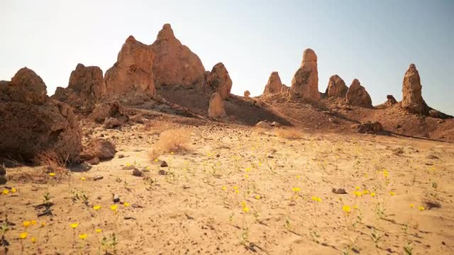 Motion control dolly time lapse footage with tilt down motion of desert flowers and rock formations in Trona Pinnacles, California