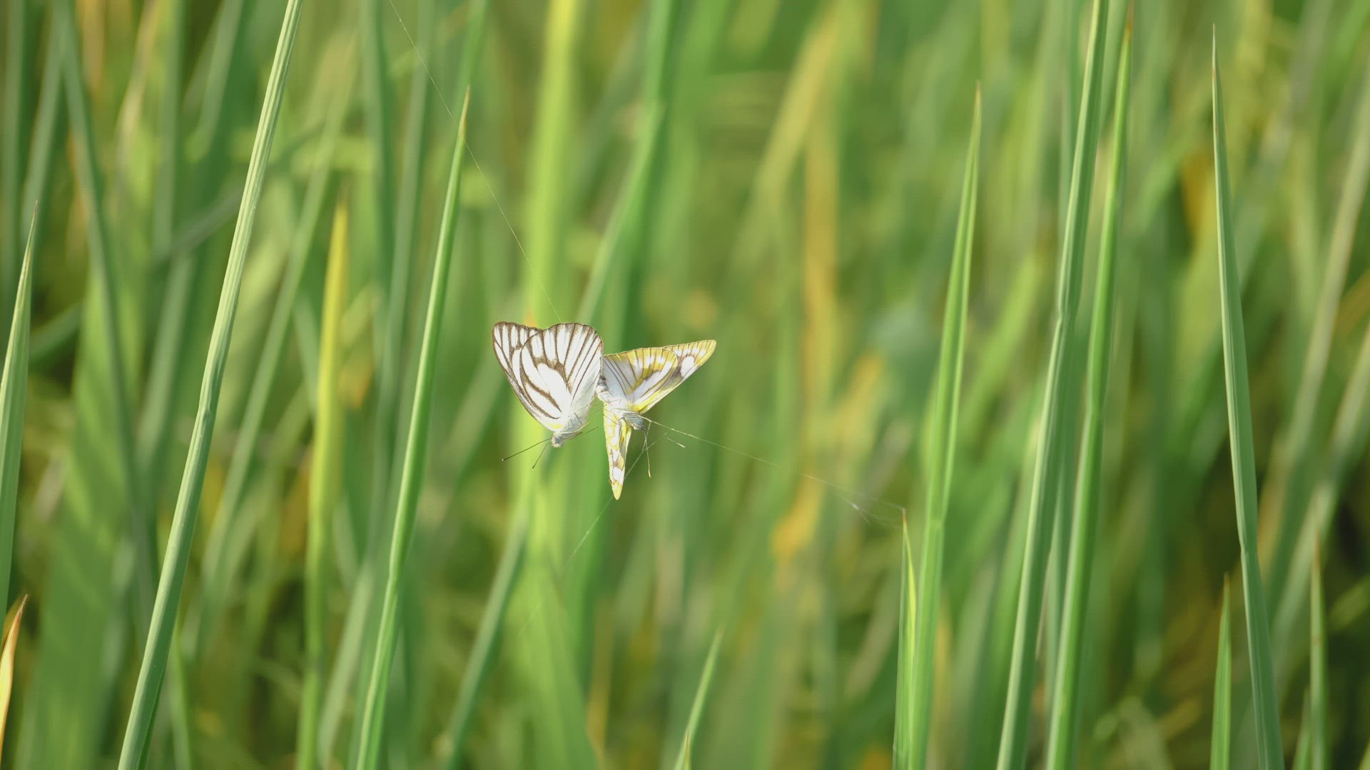 Movement of spider and net in the wind. Dawn morning in paddy field.
