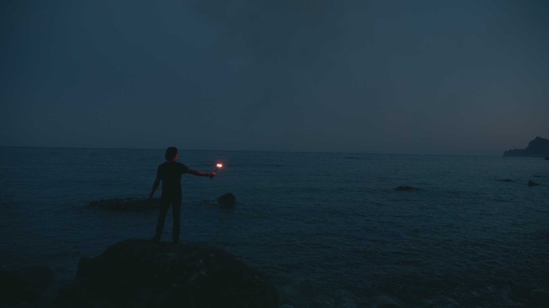 Man holds red flare at dusk on the beach