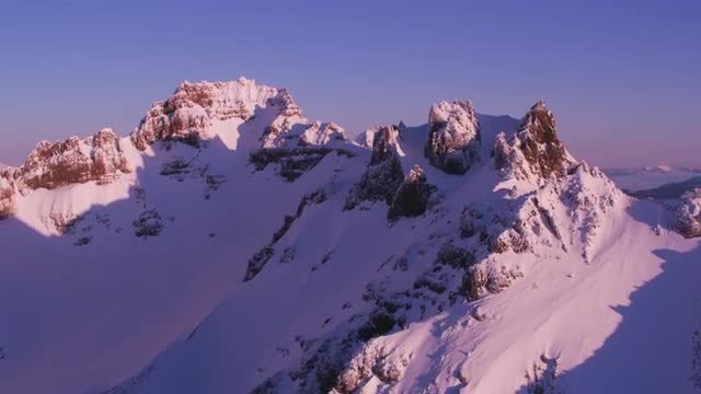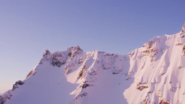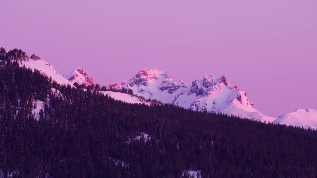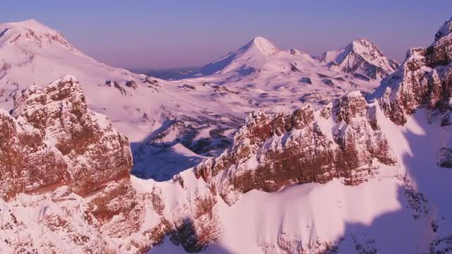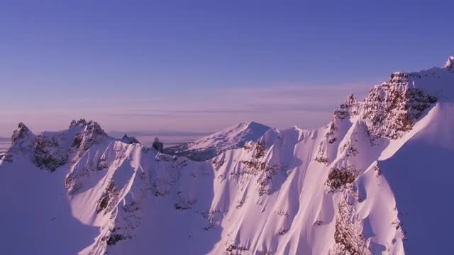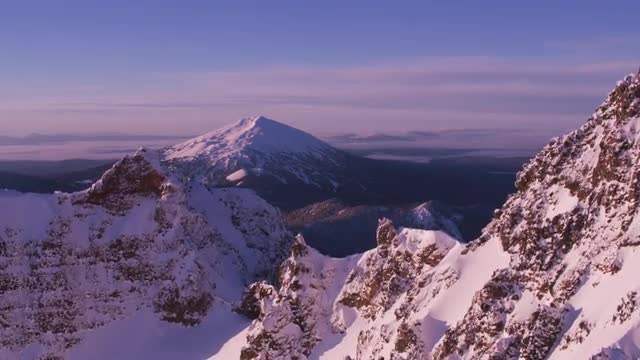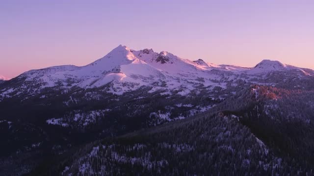 Sunrise timelapse at Broken Top with fresh snow. As the sunlight strikes the mountain and moves down, the camera tilts to follow the light and slides to the left over ice.