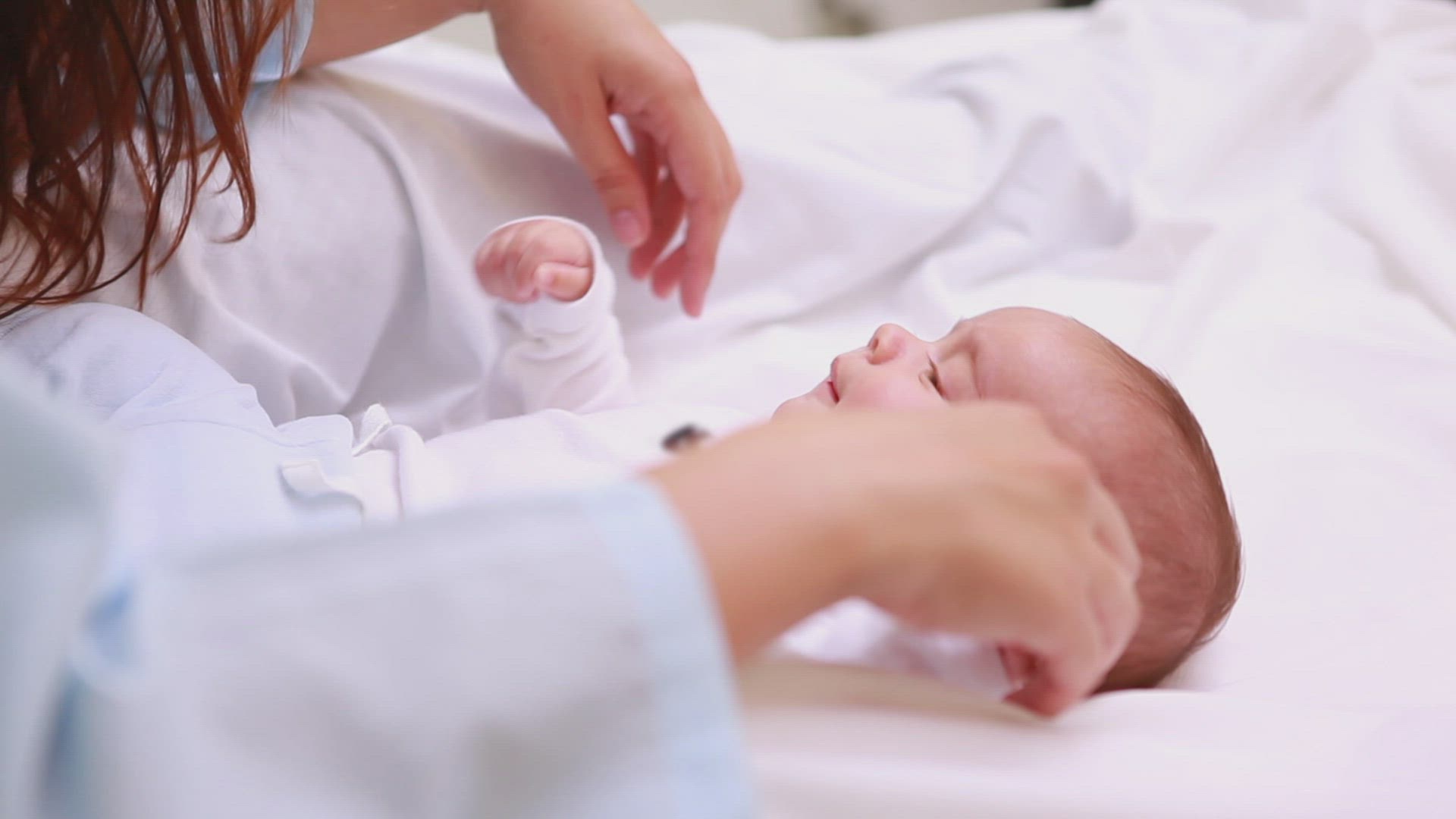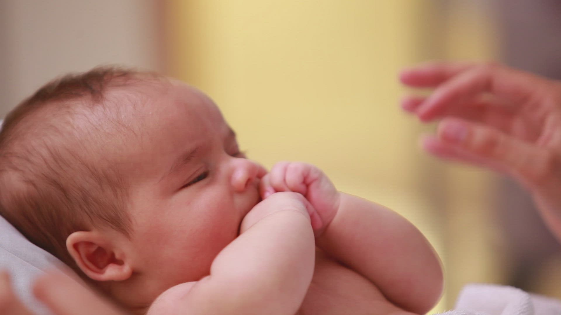 Baby opening and closing eyes and crying, comforted by her mother gently rocking her