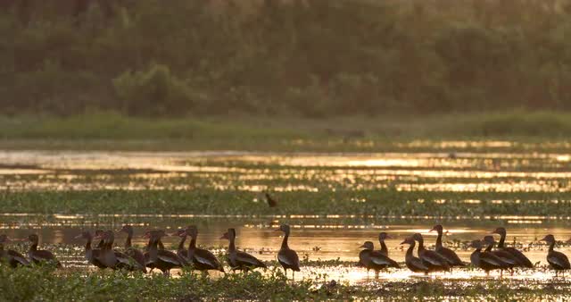 964003 - Black-bellied whistling ducks by lagoon at sunrise, golden background