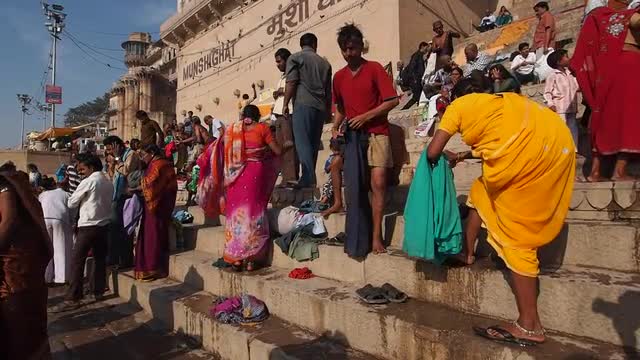 562450 - Indian man arranging religious items at shrine by the water.