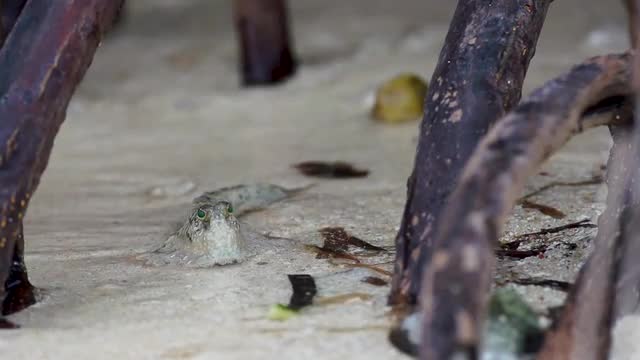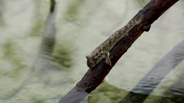 > Mudskipper stay at rock. Sea water splash the rock