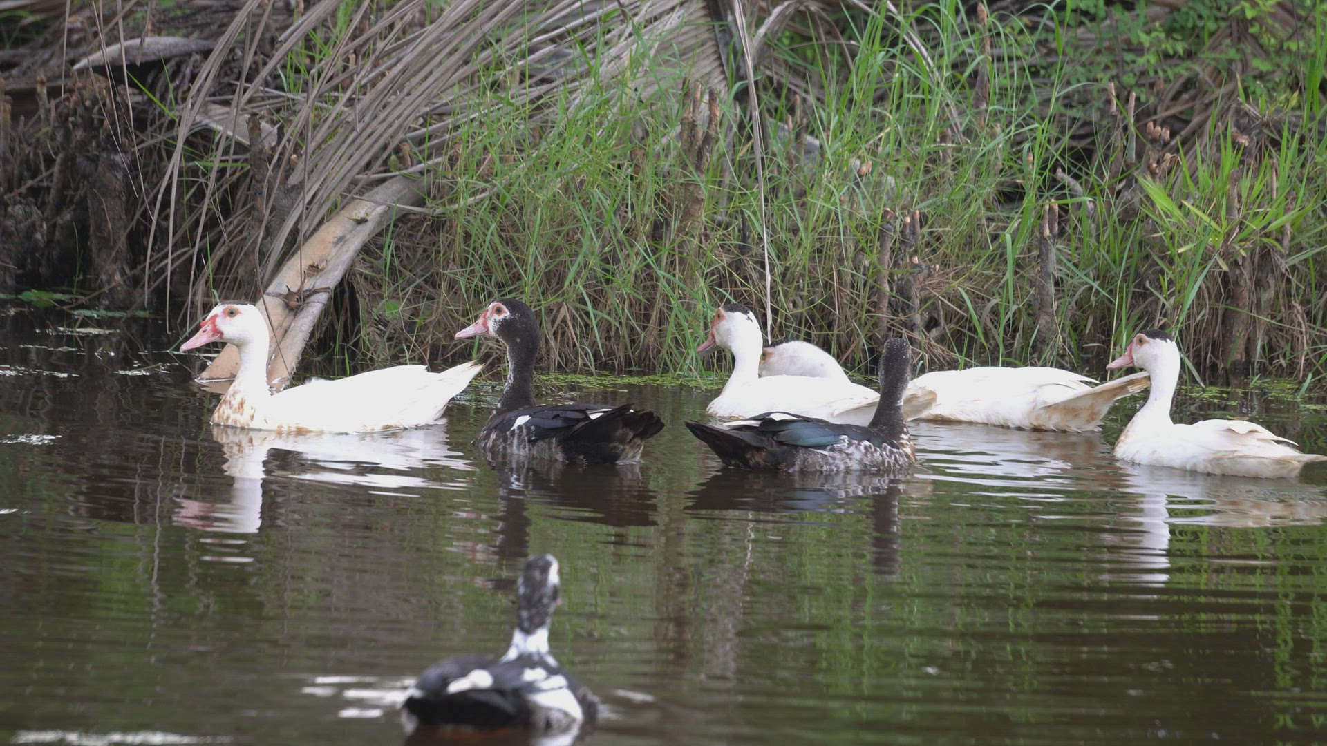 > Group of dark and white duck swim