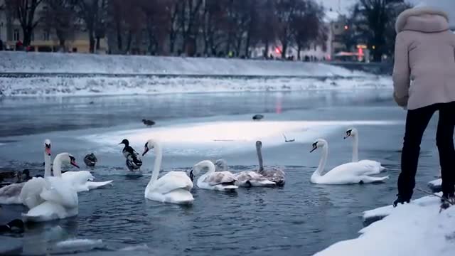 683625 - Wild Birds in the River. White Duck Swim in the River Under the Snow