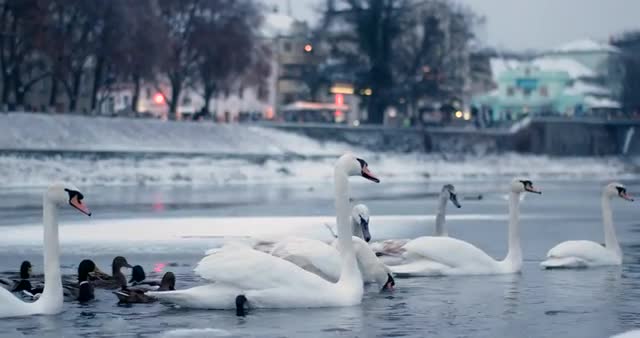 685486 - Wild Birds in the River. Ducks and Swans Swim in the Winter River