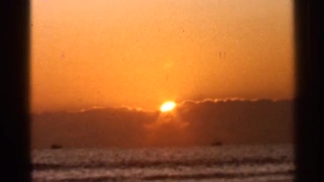 soft evening glow of the sun setting over beach. couple standing on shore taking photos of the view