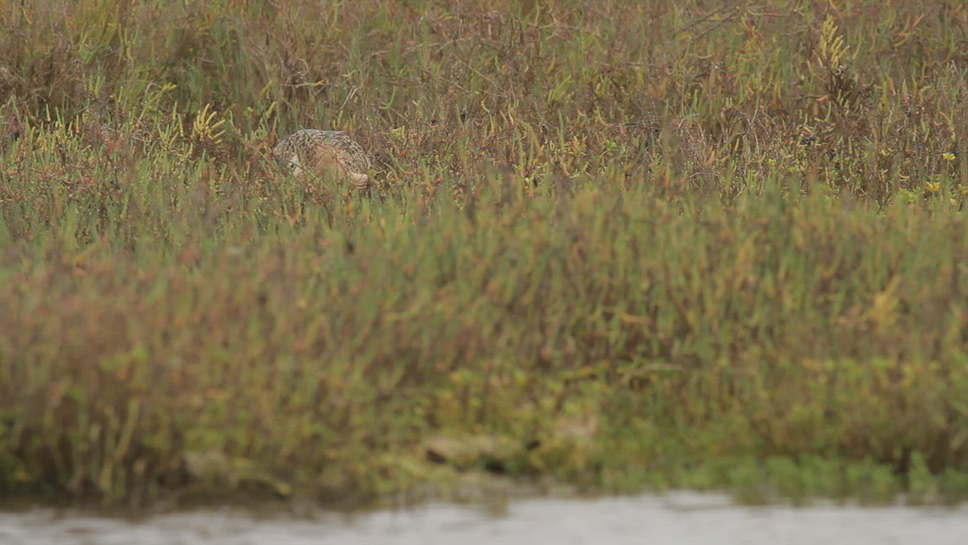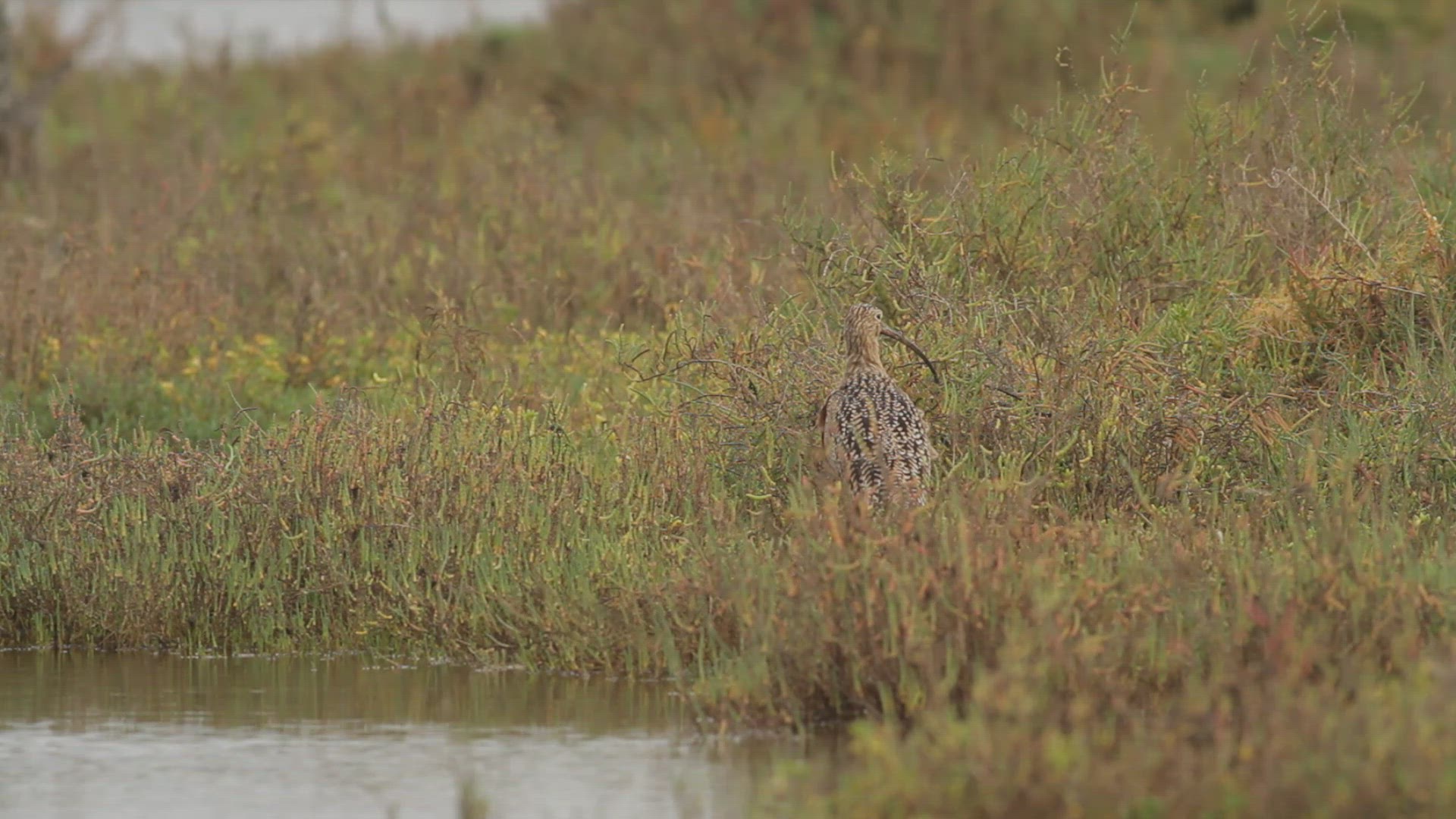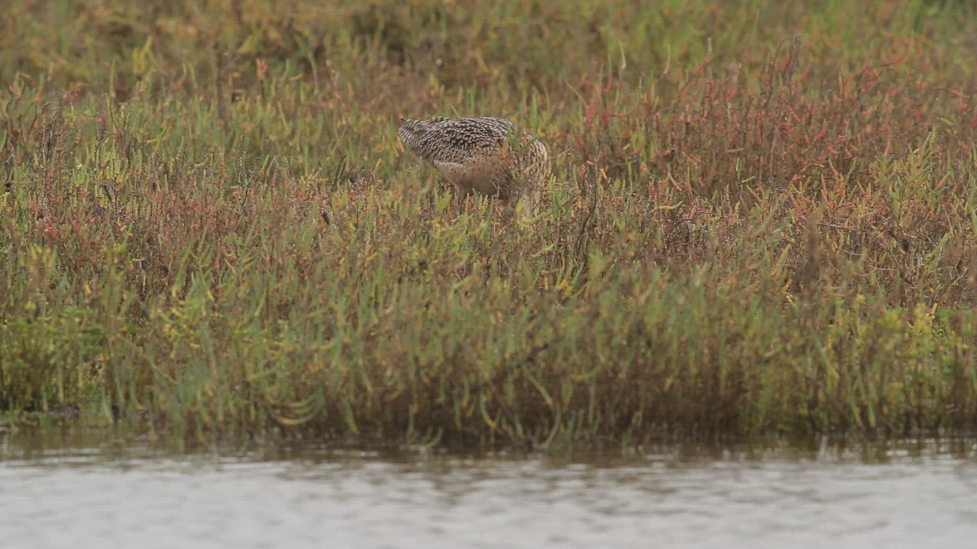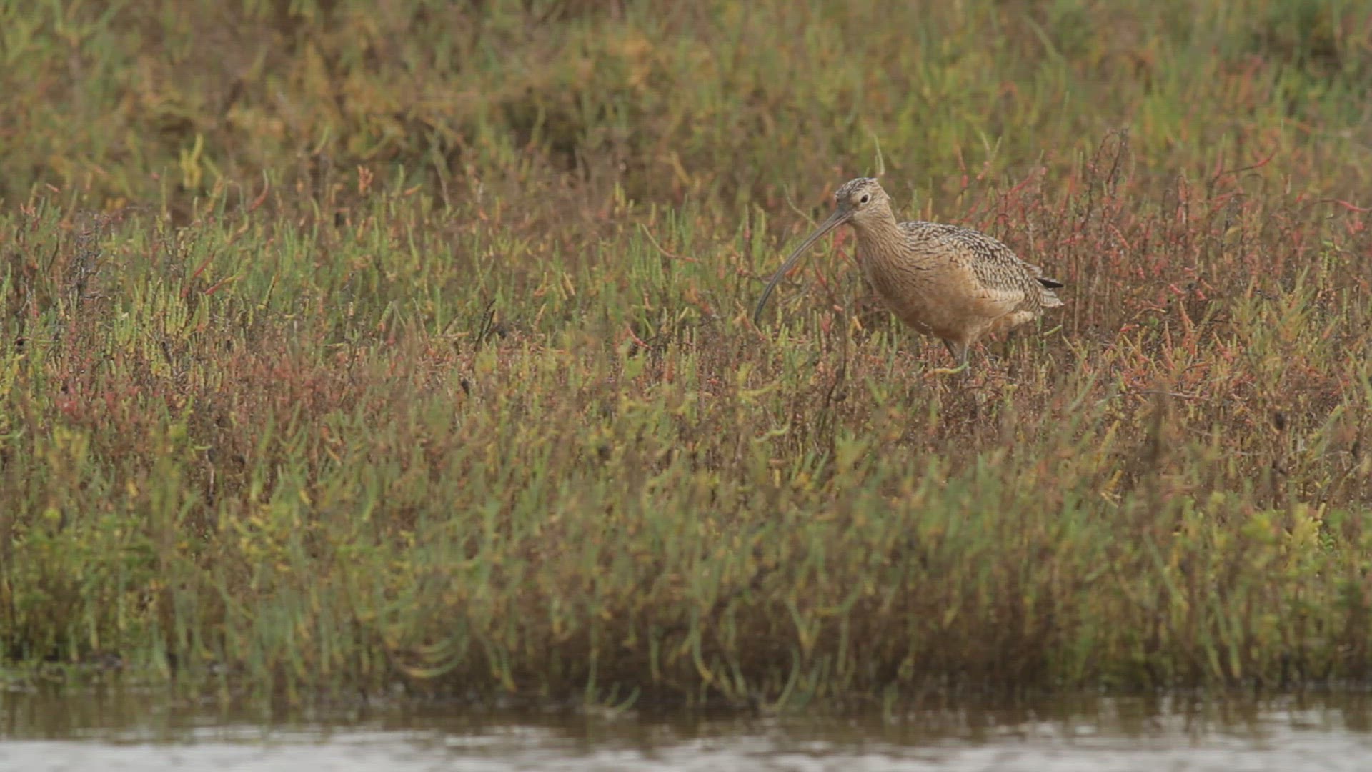 > Long-billed curlew cleans its beak after feeding on prey at a salt marsh