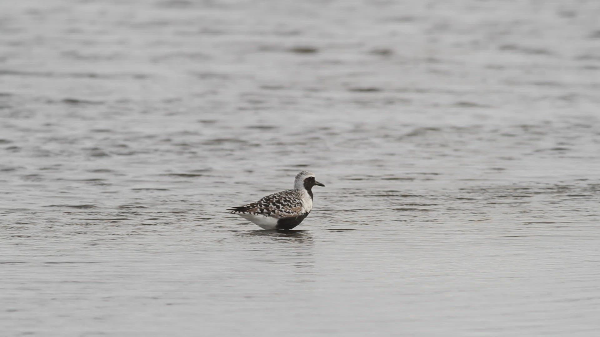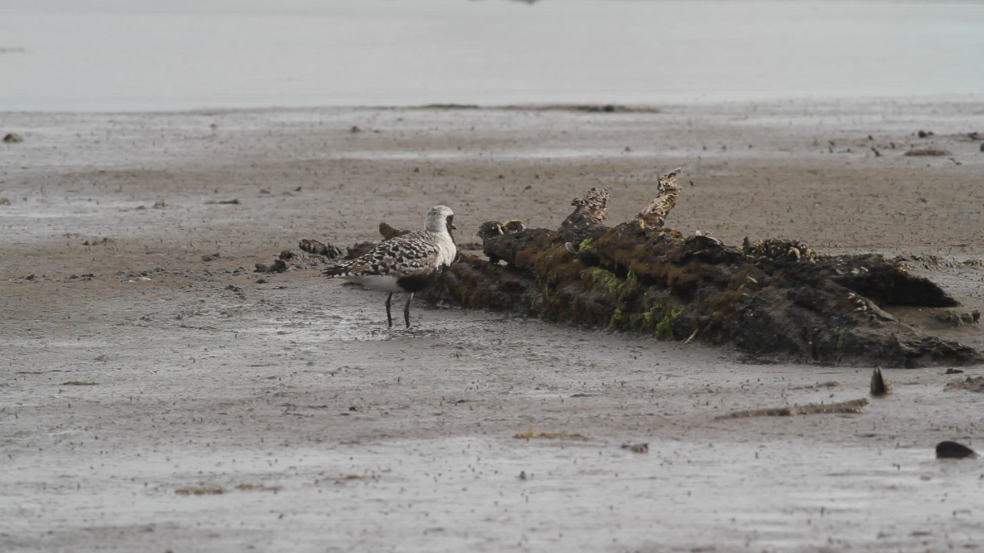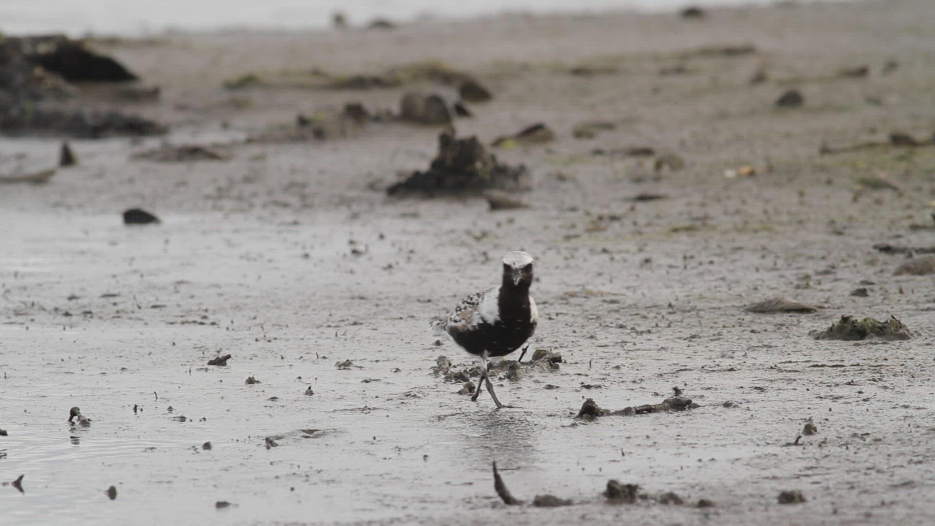 Black-bellied plover in breeding plumage forages at a salt marsh during low tide