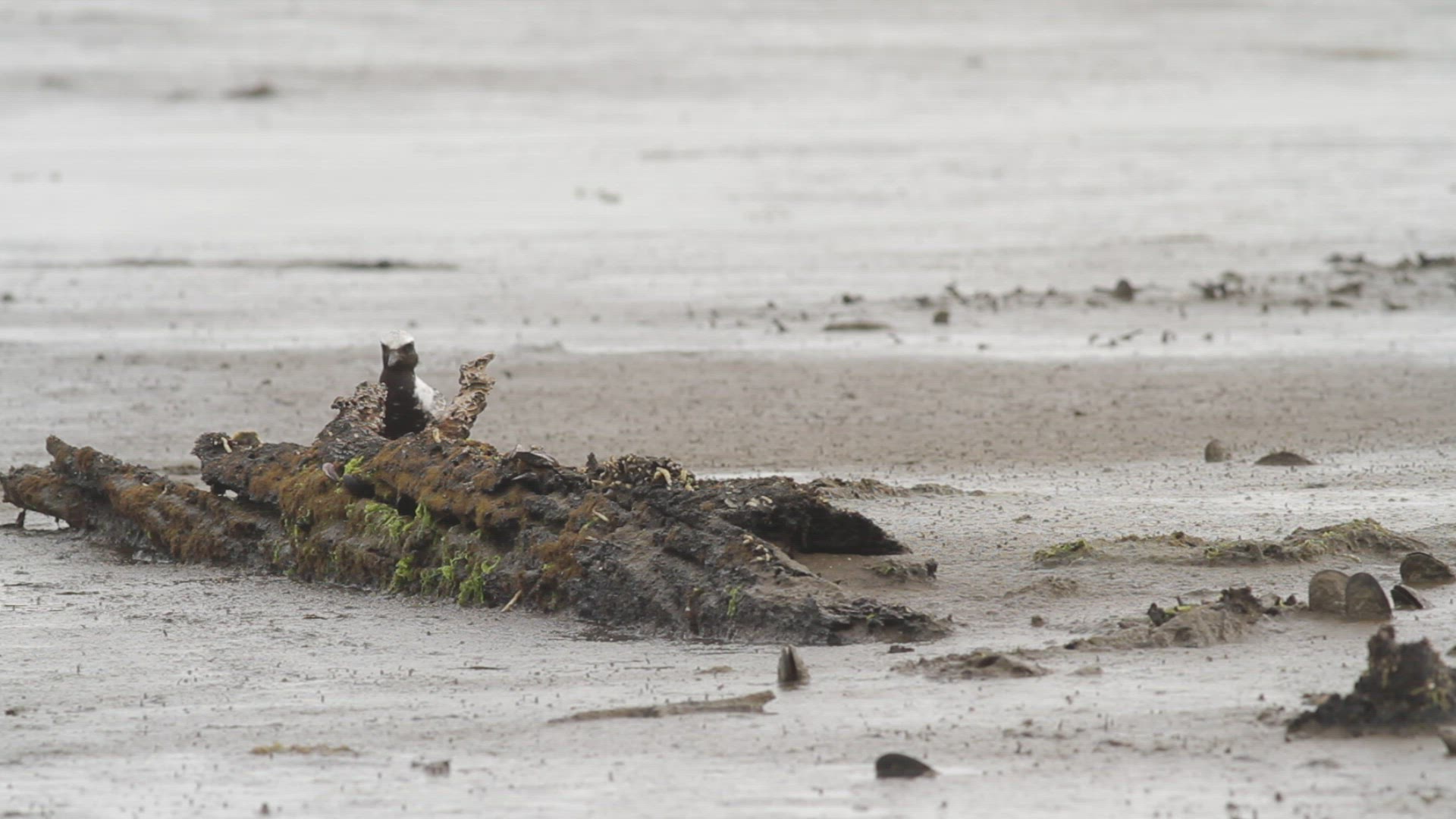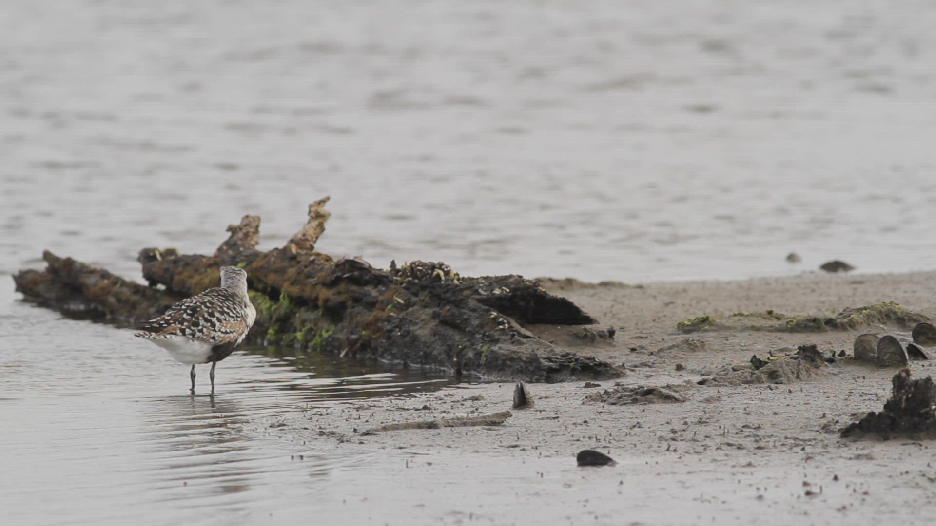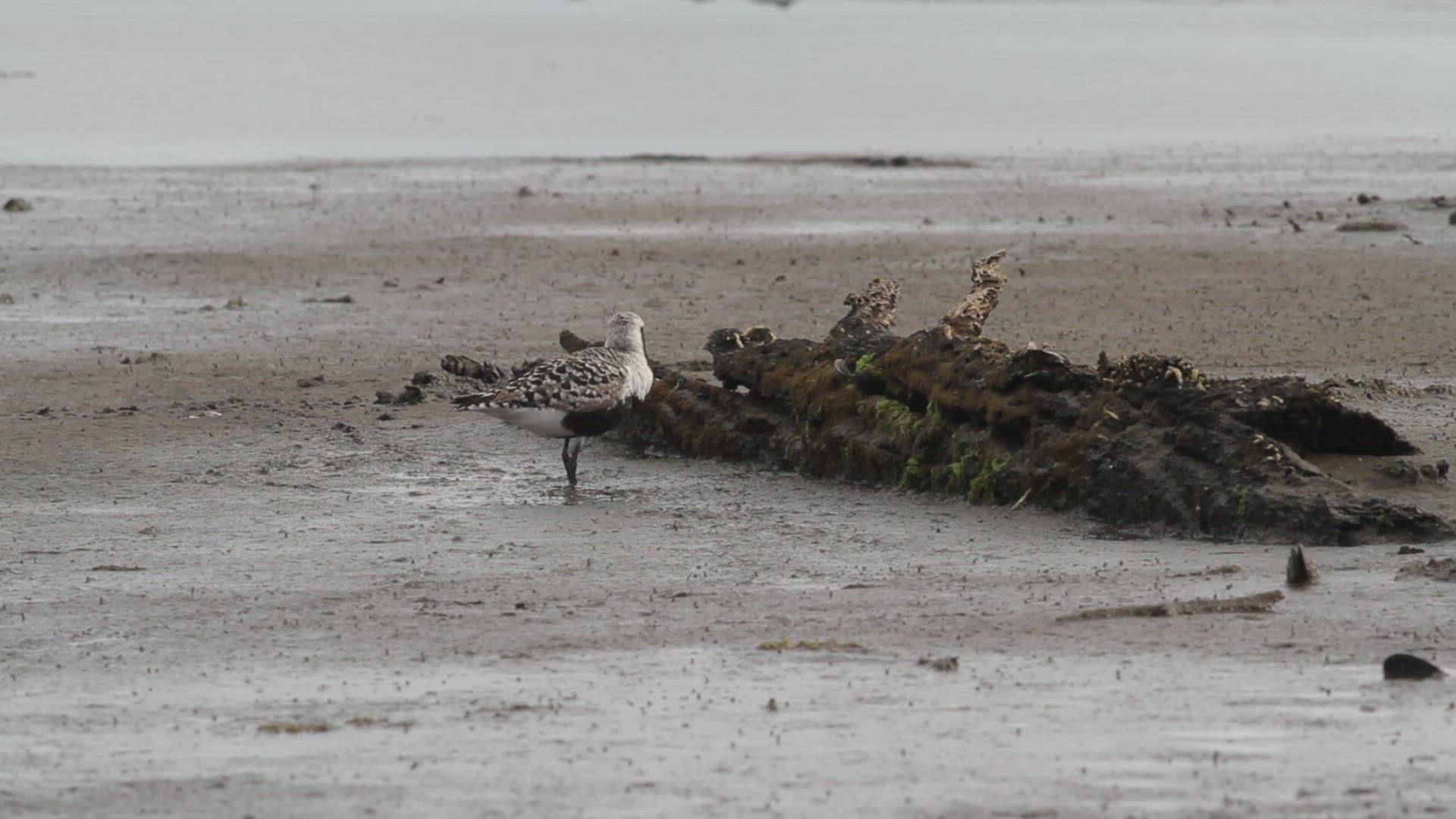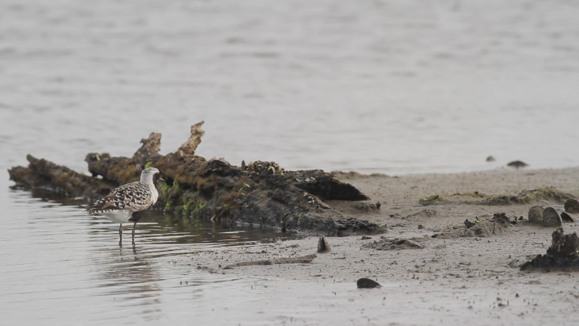 Black-bellied plover in breeding plumage forages at a salt marsh during low tide