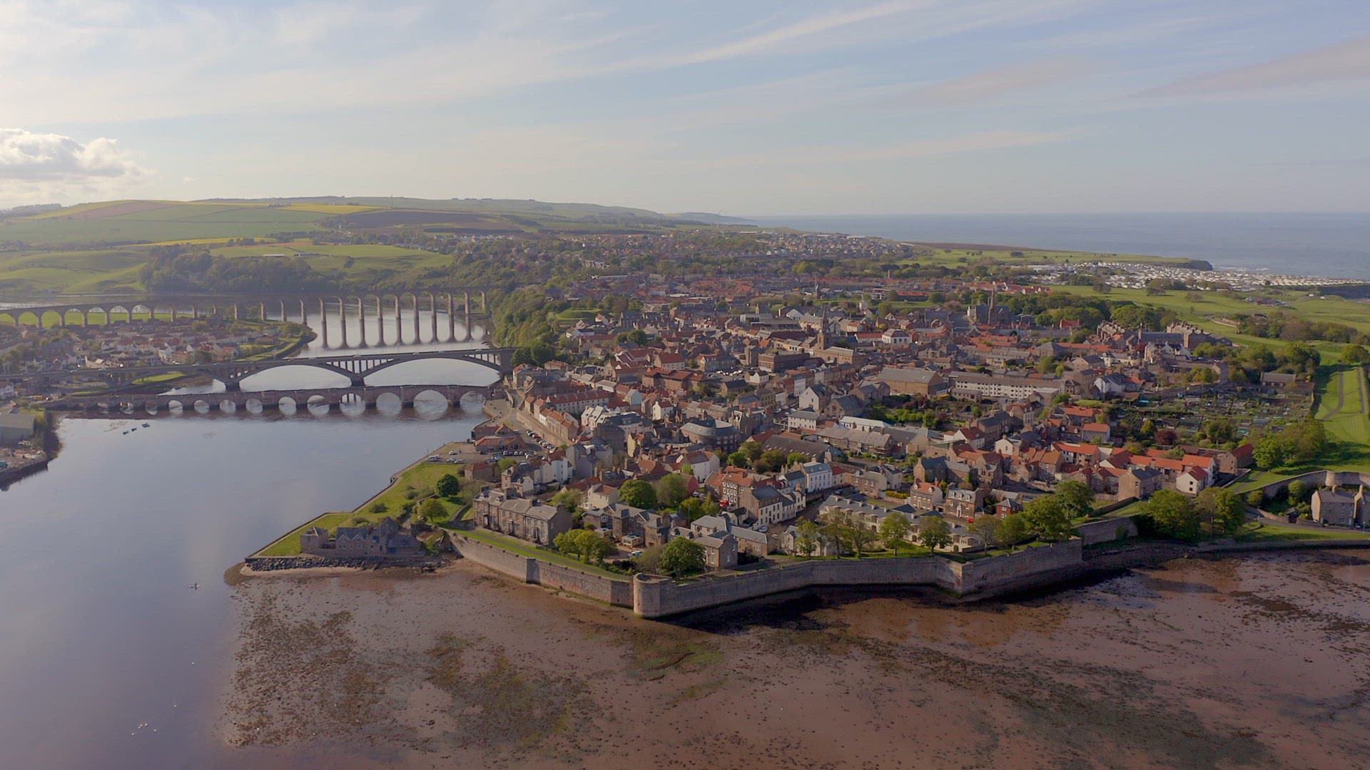 > Aerial view rows northern England terraced town houses