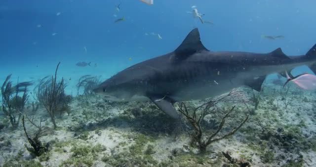 Slow motion, sharks swim underwater.
