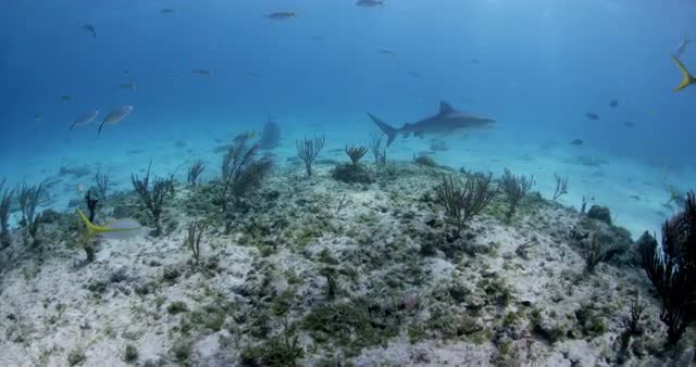 Slow motion, sharks swim underwater.