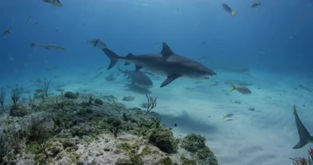 Slow motion, sharks swim underwater.
