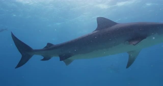 Slow motion, sharks swim underwater.
