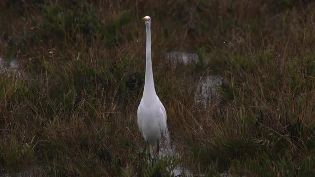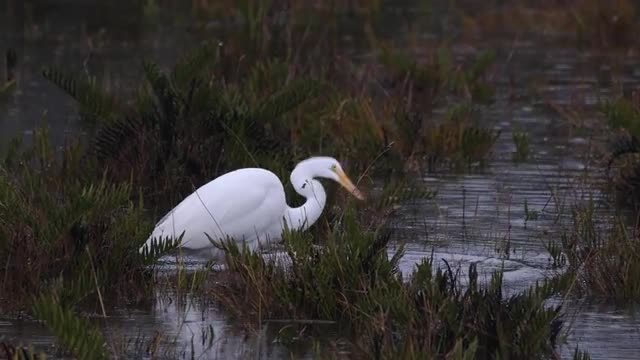 > Egret and heron birds fly at peatland