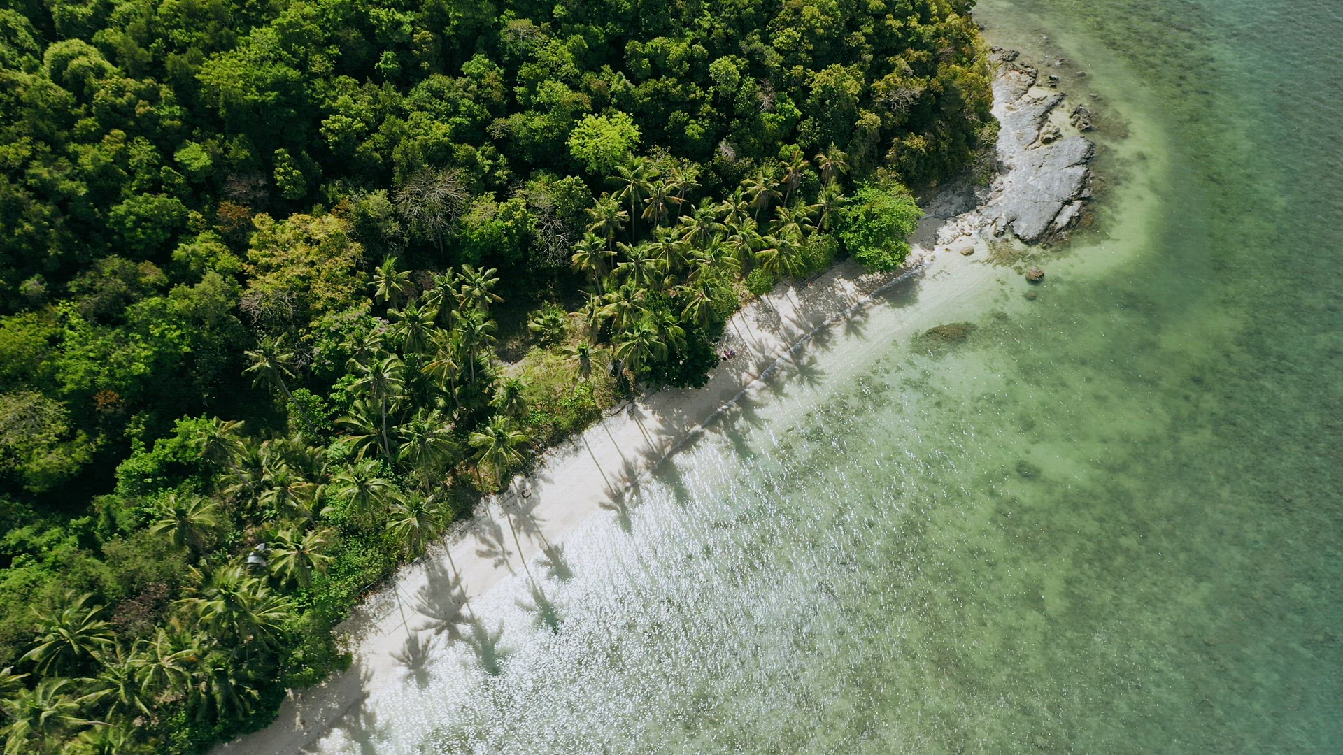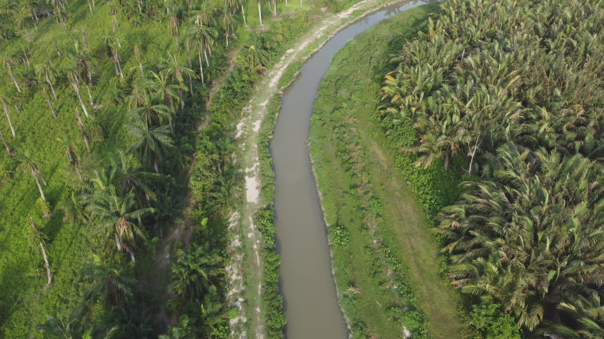 1129826 - Aerial view of the forest and river view a train with coal coming by