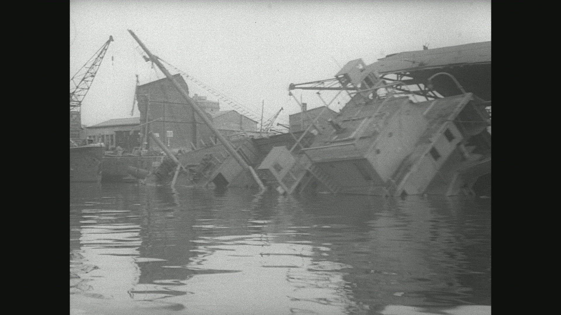 > Aerial view look down spoil abandoned wooden boat sink
