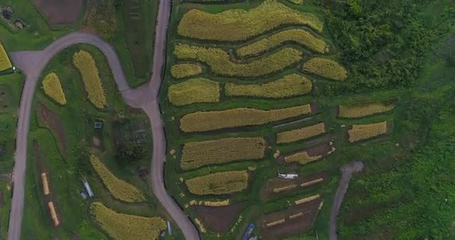 1031059 - Aerial drone cinematic shot of rice paddies at sunrise, Nagano Prefecture, Japan