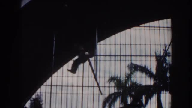 651919 - 1966: monkeys at the zoo playing on a ferris wheel jungle gym and trapeze rings and swinging upside