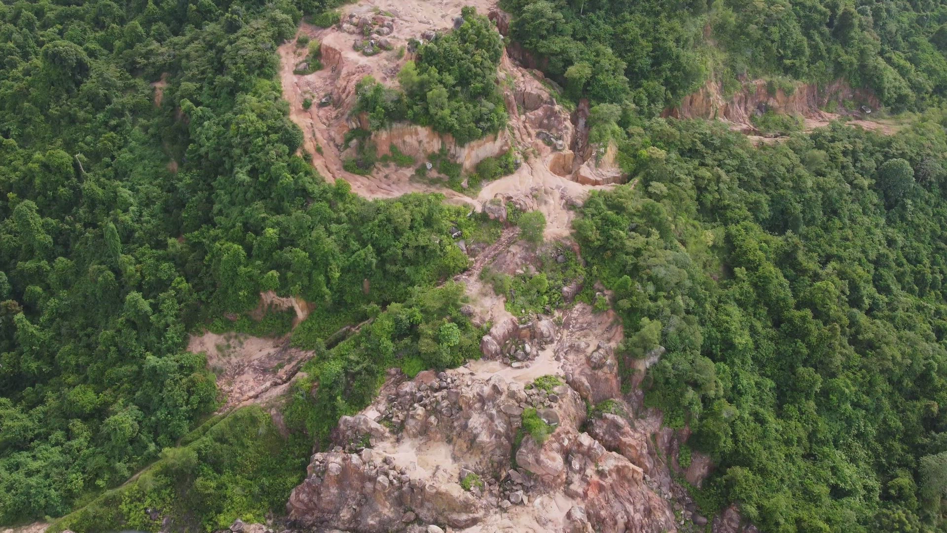 > Aerial view ascending mining of red stone in jungle.