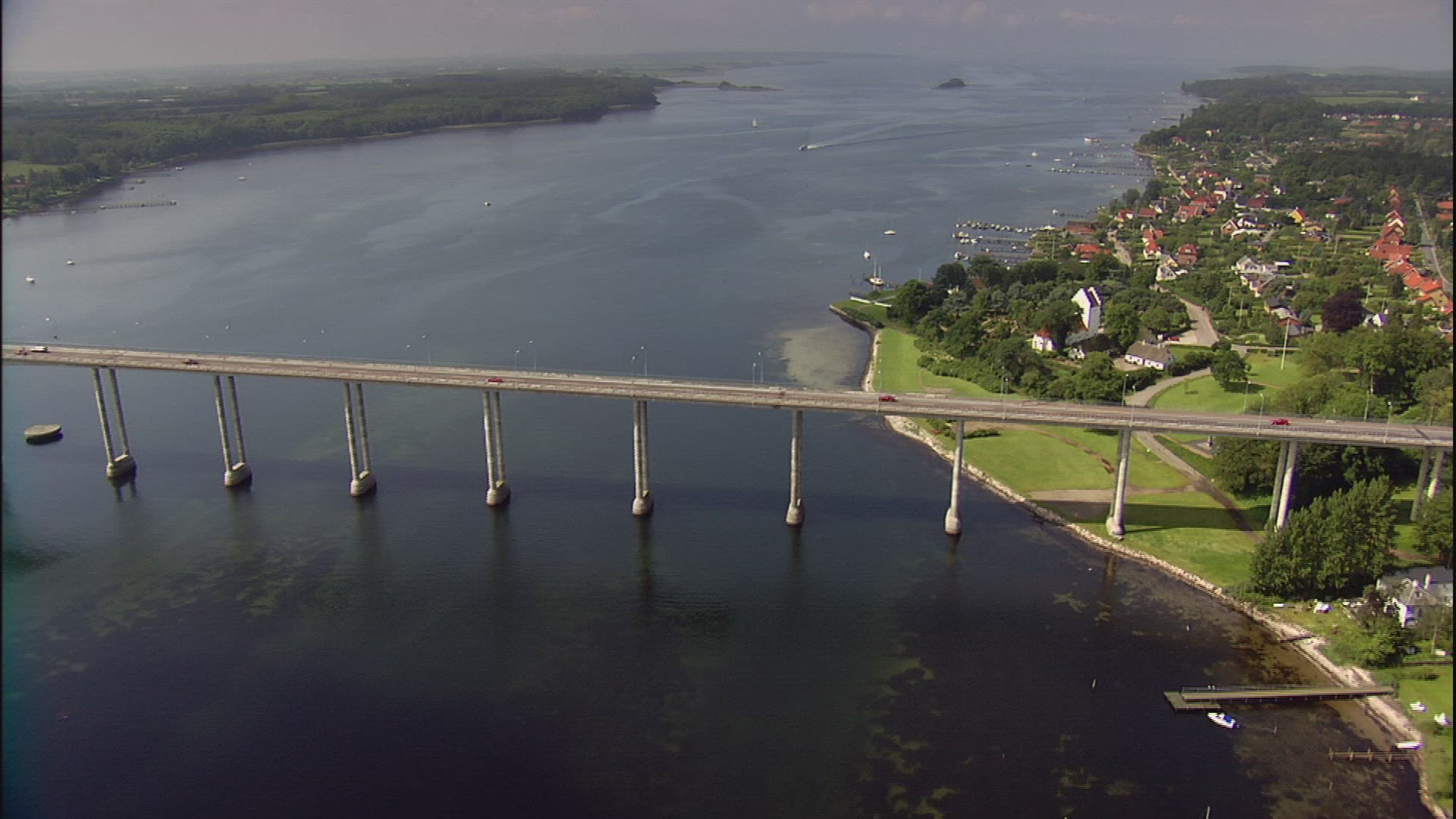 > Aerial view look down car traffic at highway connect Pennag Bridge