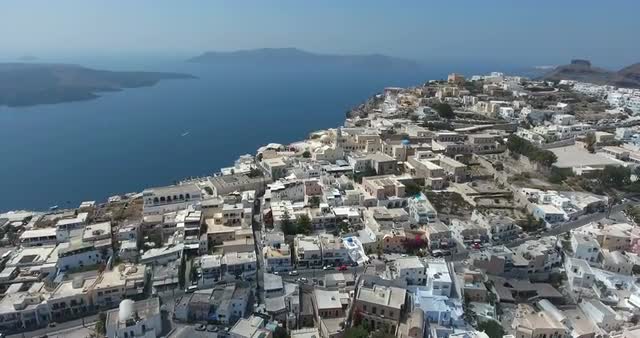 974650 - Aerial shot over Santorini cityscape on a sunny day with beautiful landscape and sea in view