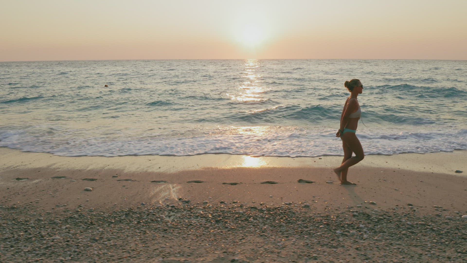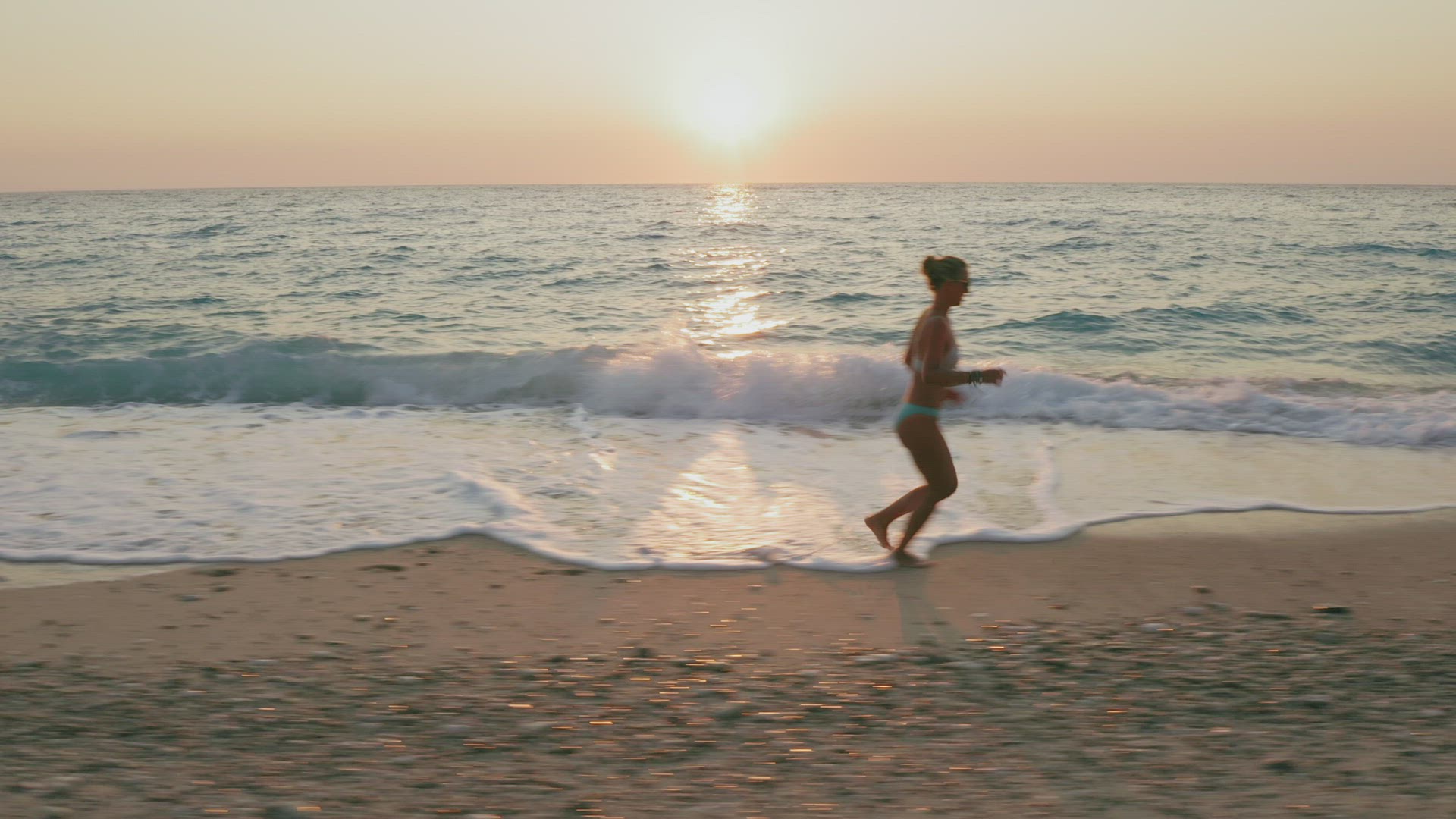 2166498 - Aerial low altitude follow view of woman running along the Milos beach of Lefkada, Ionian island, Gr