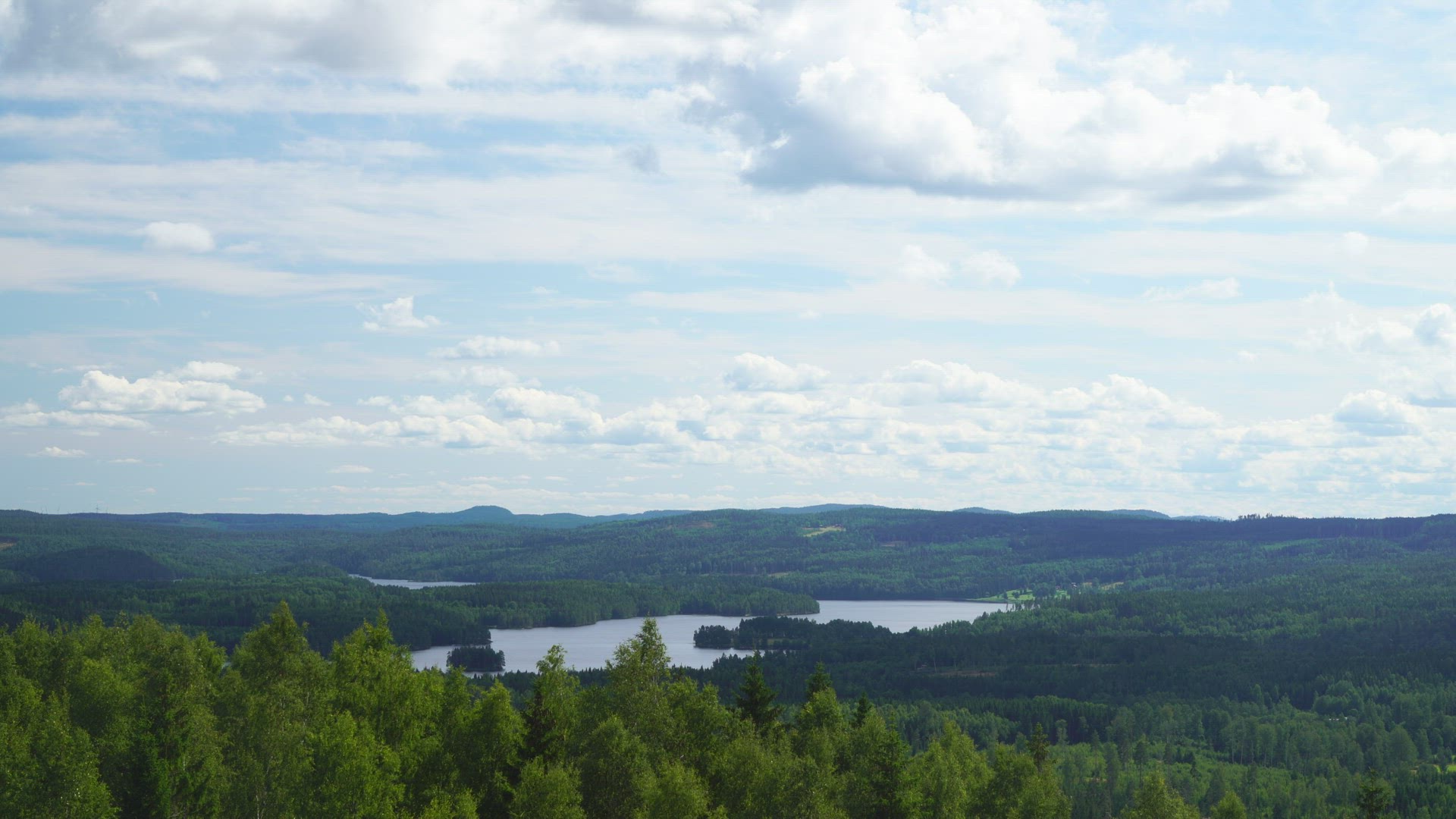 > sun shining over frozen lake in Sweden - people on ice fishing