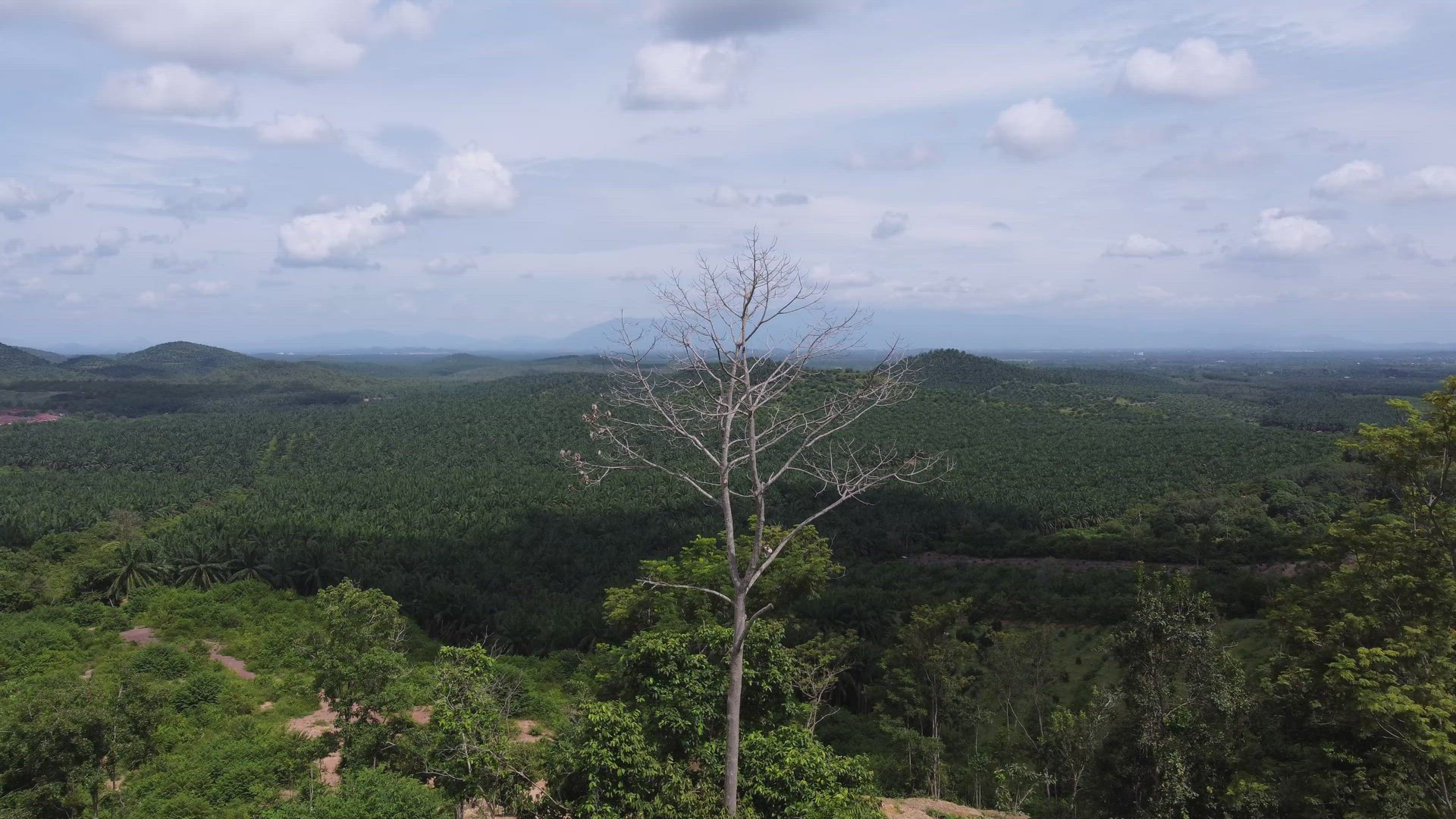 Fly toward leafless bare tree with background oil palm farm