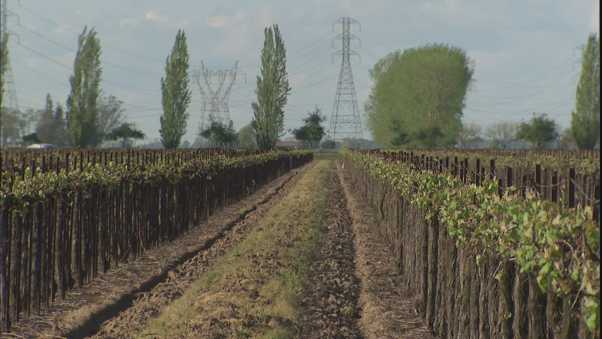 > Aerial move toward electric tower in the oil palm farm