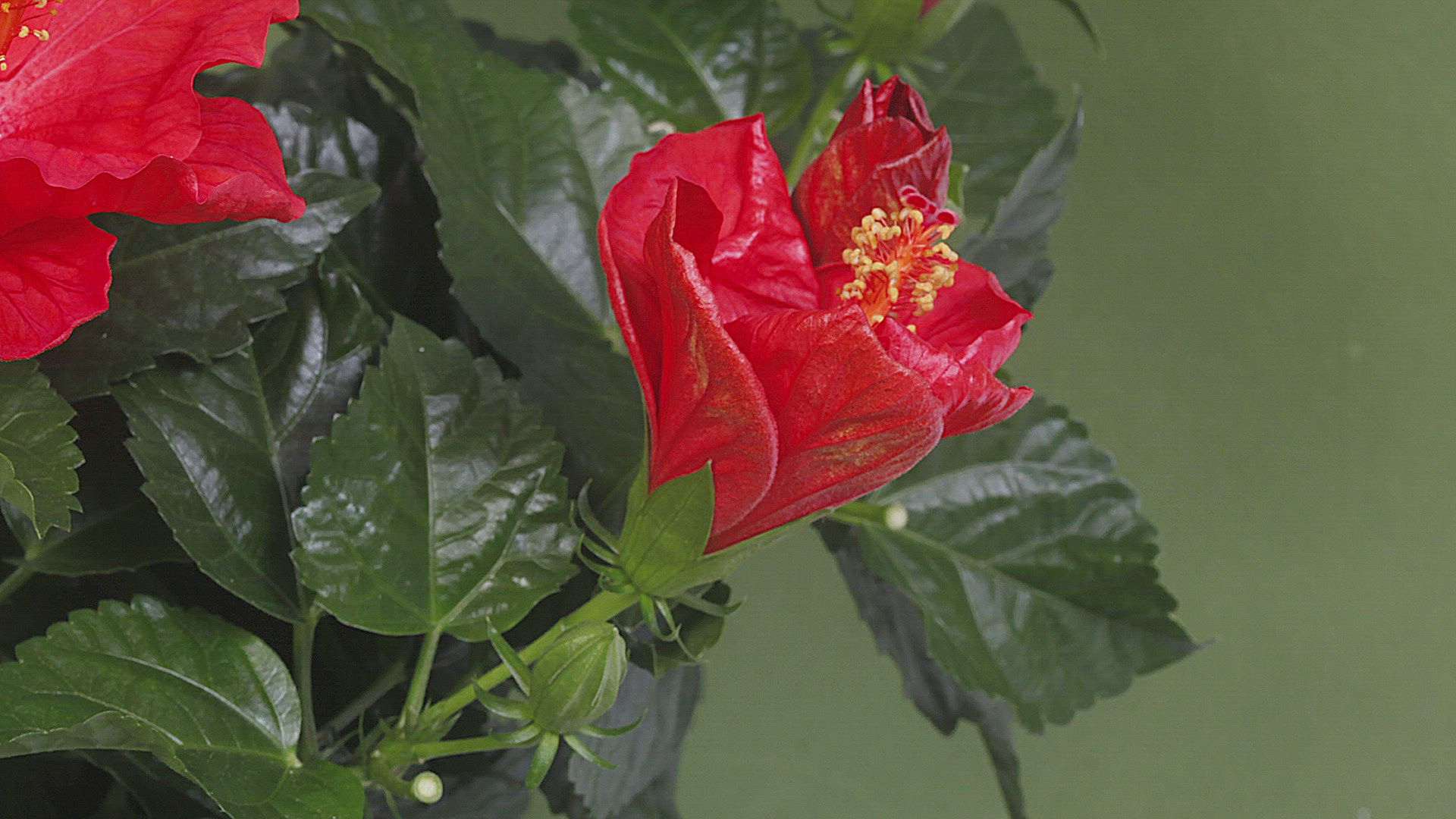 Red hibiscus is blow by wind in green background