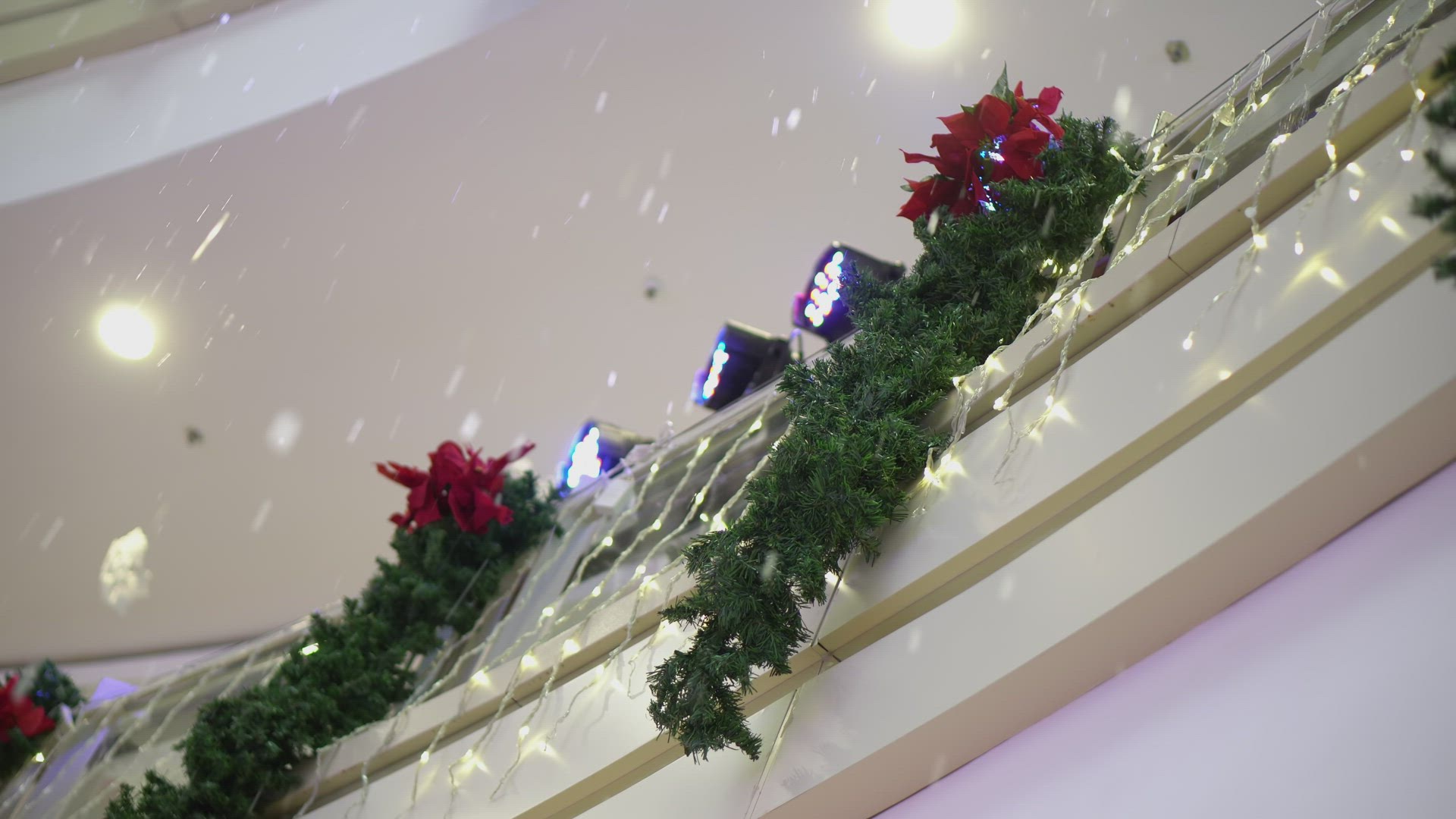 Blurry snow bokeh in blinking of christmas tree. Christmas winter holiday concept.