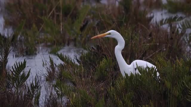 Great egret hunts in a salt marsh at twilight, Southern California