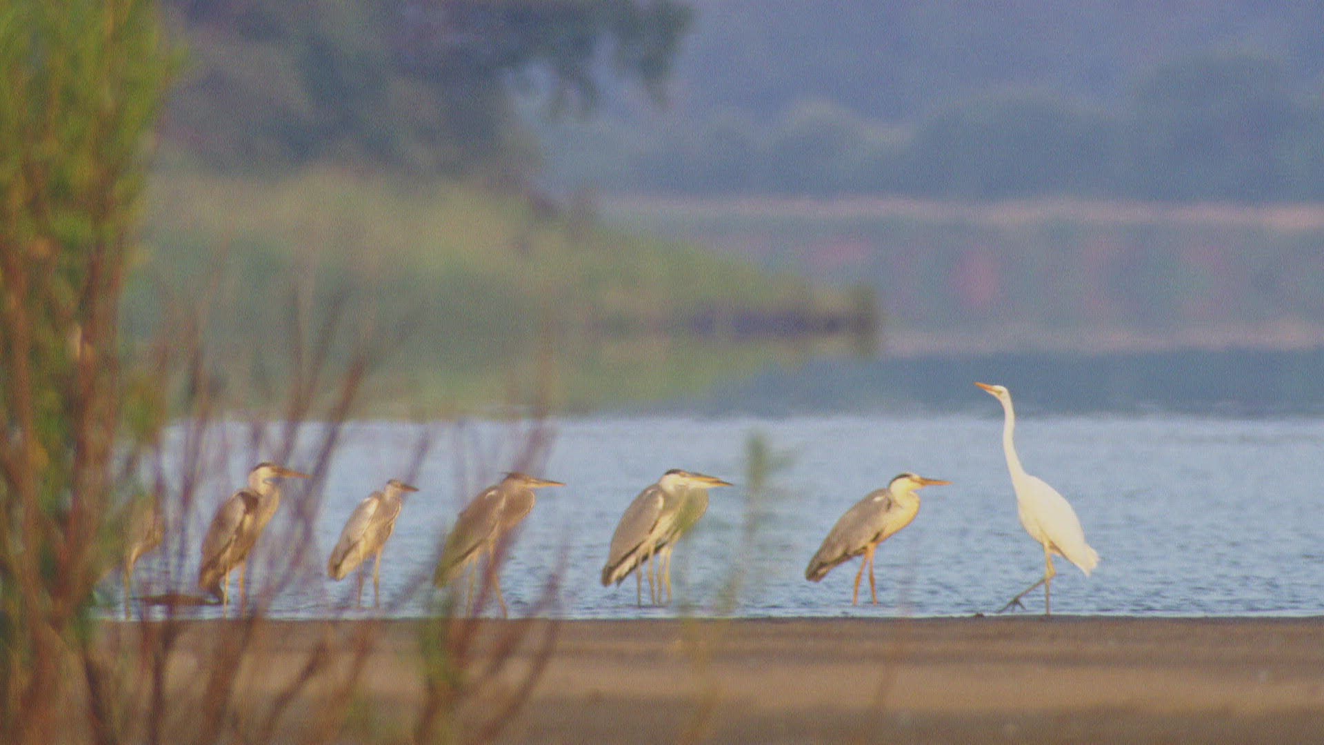 > Great egret hunts in a salt marsh at twilight, Southern California