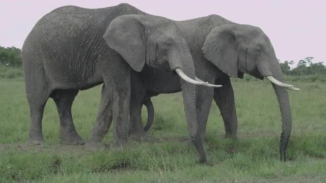 Medium wide shot of Tim the Tusker elephant reaching for branches while foraging