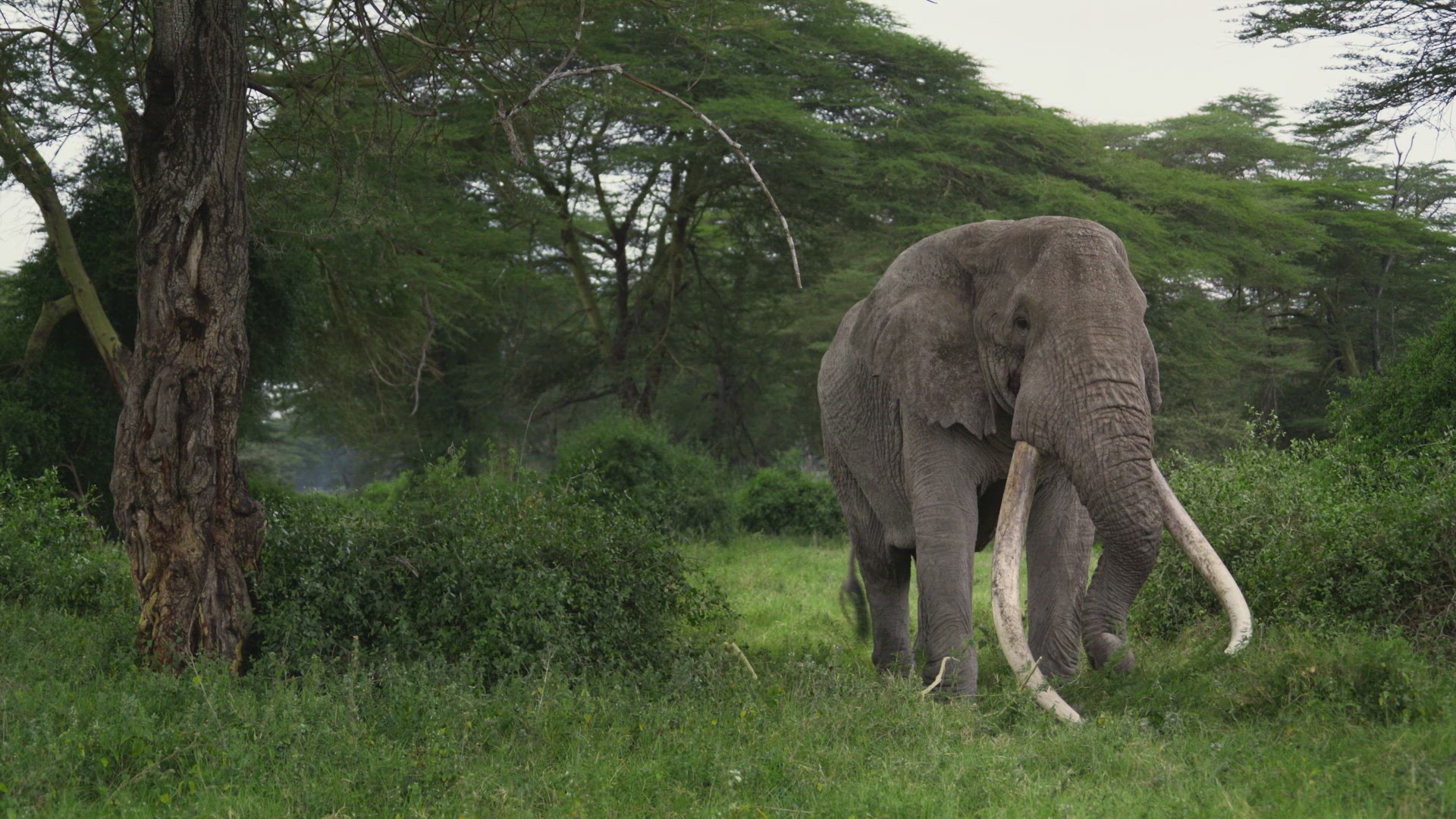 Tim faces a large tree and the sunset over Amboseli National Park, Kenya.