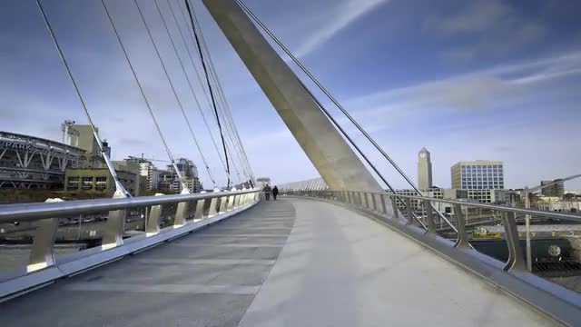 964012 - Video shot of walking bridge in central Trondheim on a cloudy day with people