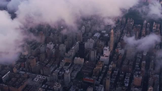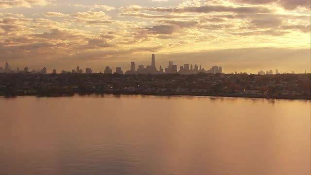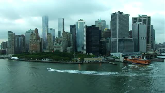One World Trade Center Building on a cloudy morning over Manhattan, New York City. Shot from Helicopter with Cineflex stabilized gimbal and RED Helium Camera.